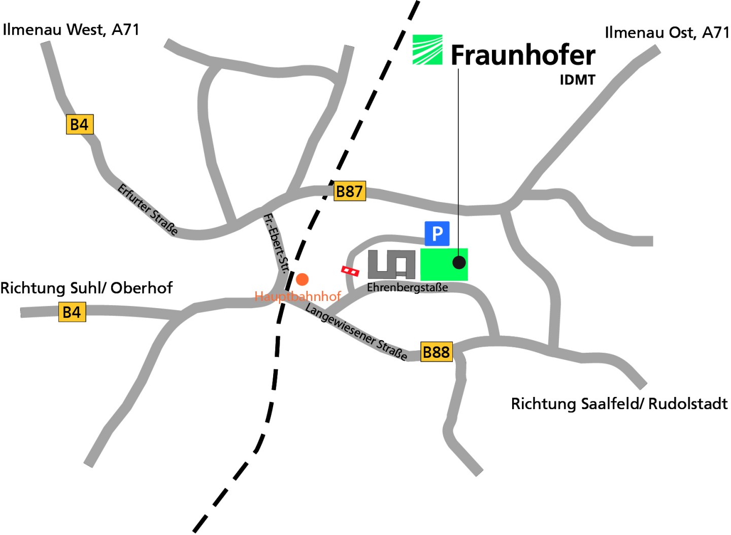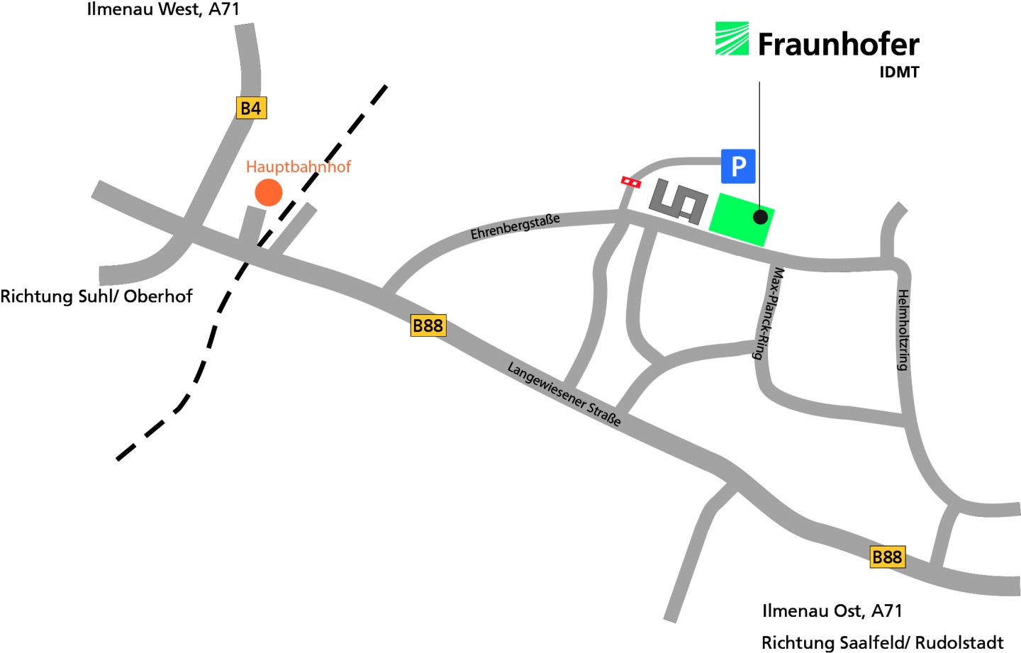 Aus Richtung Frankfurt/Dresden/Berlin (über die A4): Am Erfurter Kreuz auf die A71 Richtung Meiningen. Abfahrt Ilmenau Ost. Danach rechts auf die B87 Richtung Ilmenau. An der zweiten Ampel links fahren, Richtung TU Ilmenau. Dann rechts auf die B88 Richtung TU Ilmenau. Ortseinfahrt Ilmenau passieren. Nach ca. 1500 Metern rechts in die Ehrenbergstraße auf den Campus der TU Ilmenau abbiegen. Nach ca. 600 Metern befindet sich das Institutsgebäude auf der linken Seite neben dem Ernst-Abbe-Zentrum. Zum Parkplatz des Fraunhofer IDMT bitte vor dem Ernst-Abbe-Zentrum links einbiegen.